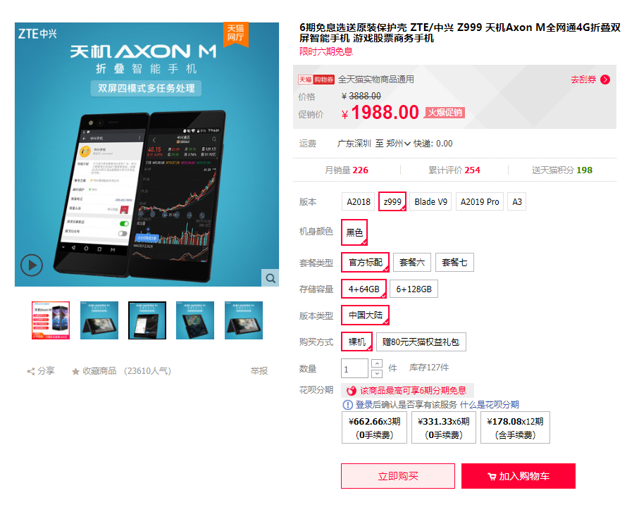 比如去年10月份,中兴发布的天机Axon M折叠手机,通过铰链连接的方式实现屏幕折叠。截至目前,该款手机在京东中兴官方旗舰店累计收到7400+用户评价,天猫仅有254条。从实际反馈来看,中兴天机Axon M就几乎占尽前面所讲折叠手机现存的一些问题,硬件和软件方面都尚存极大改进空间。不知中兴官方是否意识到了问题所在,但可以看到,其售价已经从最初的3888元、4888元调整为1988元、2588元。